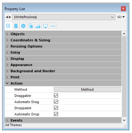 To configure the drag and drop features for your 4D Write Pro areas, you need to select the appropriate options in the "Action" theme of the Property List: