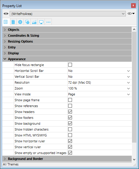 Document view settings are handled through specific items in the Appearance theme of the Property List for 4D Write Pro form objects: