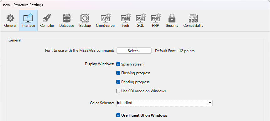 Seleccione la opción Utilizar Fluent UI en Windows en la página "Interfaz" de la caja de diálogo de las Propiedades.