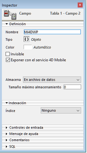 En la estructura de su base de datos, todo campo objeto 4D se puede utilizar para almacenar los documentos 4D Write Pro. Como en cualquier campo Objeto, debe definir, en función de sus necesidades: