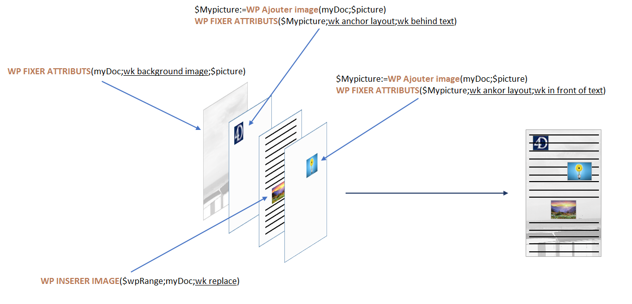 - pour ajouter une image ancrée dans la page (derrière ou devant le texte), utilisez la commande WP Ajouter image.