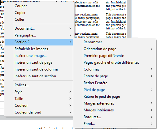 Les sections héritent des attributs du document. Cependant, les attributs de documents communs, y compris les en-têtes et pieds de page, peuvent être modifiés séparément pour chaque section. Le menu contextuel affiche les propriétés et attributs disponibles au niveau des sections :