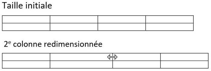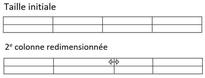 La largeur des colonnes du tableau peut être modifiée en faisant glisser le séparateur de colonne vers la gauche ou la droite. Le curseur change pour indiquer qu'il peut être déplacé horizontalement et une ligne verticale apparait dans la règle :
