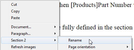 セクションブレークが追加されたとき、コンテキストメニューはそれぞれのセクションに対しインクリメントされた数字を表示します。セクション名は任意に改名することも可能です: