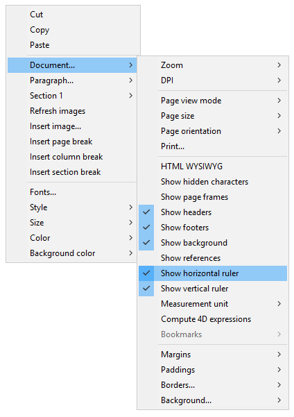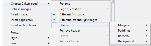 セクションのヘッダーとフッターが定義できたら、コンテキストメニューを使用してそれらの属性を設定することができます: