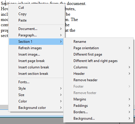 セクションはドキュメント属性を継承しますが、ヘッダーとフッターを含むドキュメント属性は、セクションごとに個別に編集することも可能です。コンテキストポップアップメニューは、セクションレベルで利用可能なプロパティと属性を表示します: