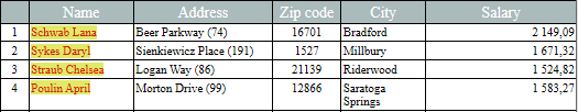 データソースのフォーミュラオブジェクトが(空でない)コレクションまたはエンティティセレクションを返す場合、フォーミュラが計算されるとすぐに表はデータが埋められます。表にはコレクション内にある要素数分だけ、あるいはエンティティセレクション内のエンティティ数分だけ行が表示されます。(ヘッダー行を除いた)最初の行はテンプレート行として使用され、そこにはThis.item.lastname といったような特別なキーワードを使用した式を挿入することができます。式はコレクションまたはエンティティセレクションからのデータの処理中に置き換えられます。このテンプレート行は、フォーミュラが計算された後のコレクションまたはエンティティセレクション内の項目数と項目行の数が合致するように複製されていきます。