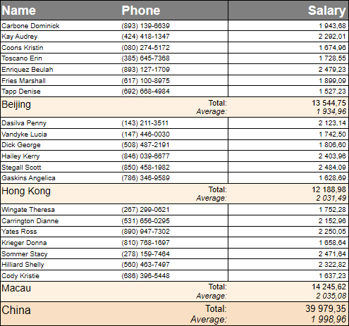 フォーミュラの値が変わるたびに、新しいブレーク行が挿入されます。そのため、表が正確にレンダリングされるためには、表のデータソースとして使用されているエンティティセレクション(またはコレクション)は適切にソートされている必要があります。例えば、国ごとおよび都市ごとにブレーク行を挿入したい場合、データソースは以下のように指定されている必要があります: ds.people.all().orderBy("country asc, city asc")