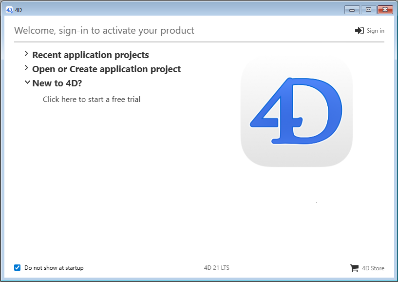 Quando tiver completado a instalação, pode iniciar 4D e entrar. Para fazer isso, clique duas vezes no ícone do produto 4D.