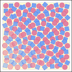 Specify a graphic composed of two red circles and two blue squares. Then use this graphic in a loop to create 36 occurrences with varying positions, opacity and rotation of the original graphic.