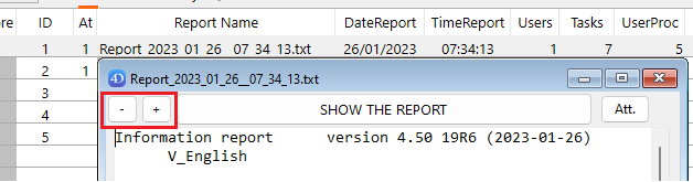 In the dialog displayed after creating a report, there are now two buttons (“-” and “+”) to decrease/increase the font size of the report area (see page 17)