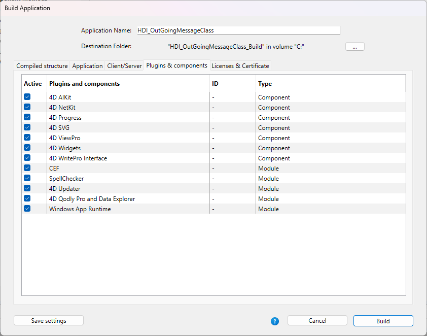 Default parameters are used the first time the Build Application dialog box is used. The contents of the project file are updated, if necessary, when you click Build or Save settings. You can define several other XML settings file for the same project and employ them using the BUILD APPLICATION command.