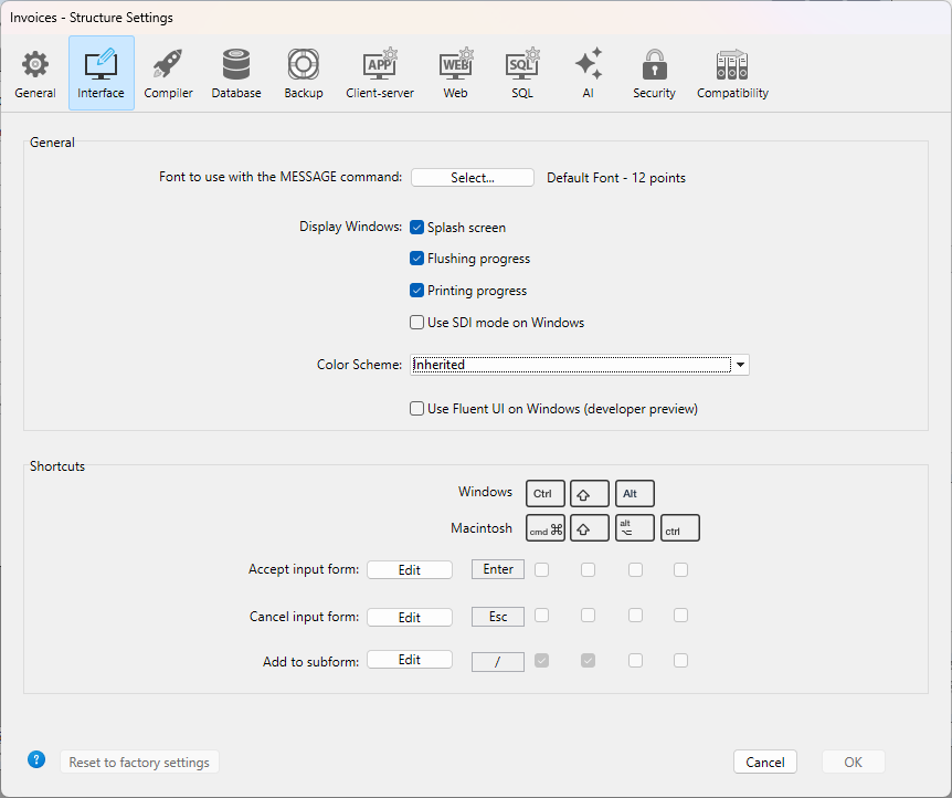 Modo Estándar: todos los parámetros se almacenan en el archivo settings.4DSettings al nivel del proyecto y se aplican en todos los casos. Este es el modo por defecto, adecuado para la fase de desarrollo (todas las aplicaciones).