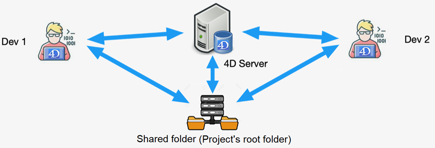 This feature is designed for small-size development teams who are used to work on binary databases and want to benefit from project features while maintaining their current organisation. However, for multi-user development on 4D projects, we recommend using a standard architecture where developers work on their machine and manage their work using source control repository tools (Git, SVN, etc.). This organisation provides a great flexibility by allowing developers to work on different branches, and compare, merge, or revert modifications.