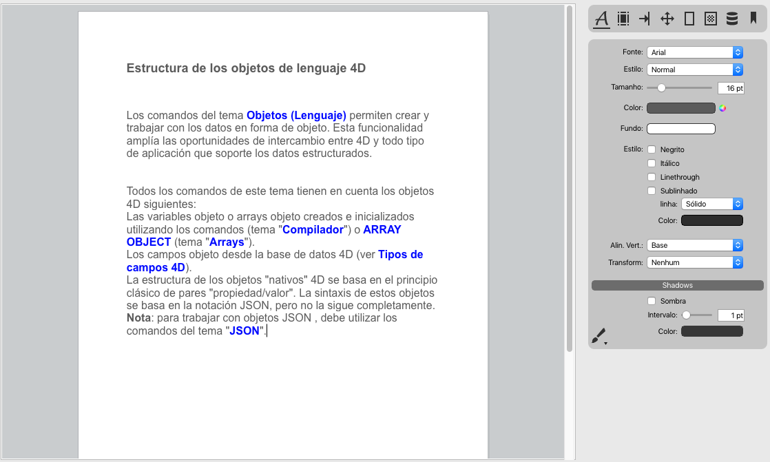 - Processamento de textos: um objeto 4D Write Pro objeto alinhado em um formulário oferece funcionalidades de processamento de texto estandarte, incluindo texto e manipulação de parágrafos e de estilos, inserção de imagens, importação e exportação, e muito mais.