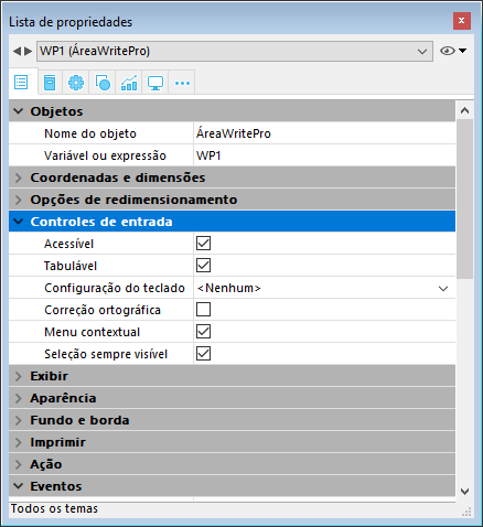 As propriedades "Entrada" gerenciam funcionalidades básicas para a introdução de texto: