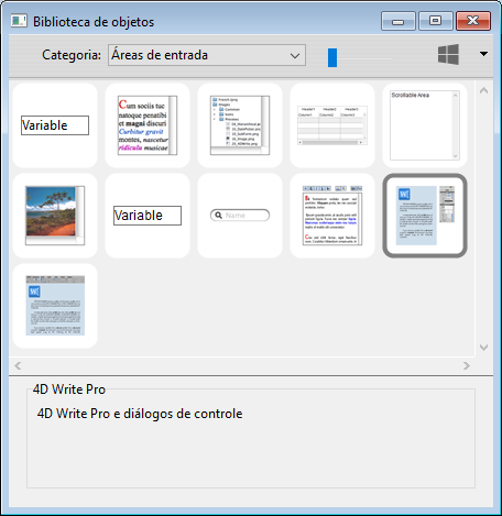 Pode criar uma área 4D Write Pro pré-configurada utilizando o objeto 4D Write Pro que se encontra na biblioteca de objetos (tema "Áreas de entrada"):